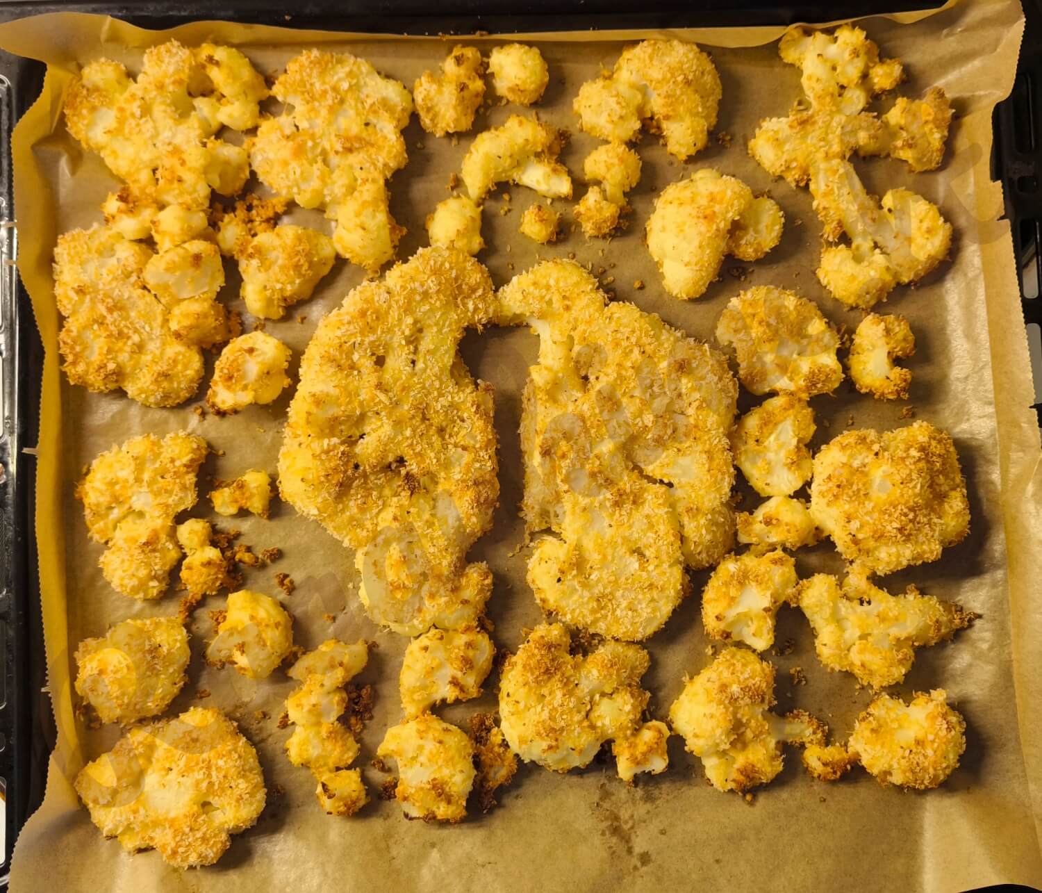 • Jei norisi minkštesnių kalafiorų, prieš kepant galite juos apvirti 3–4 minutes, tada kepimo laiką sutrumpinkite ~5 minutėmis.