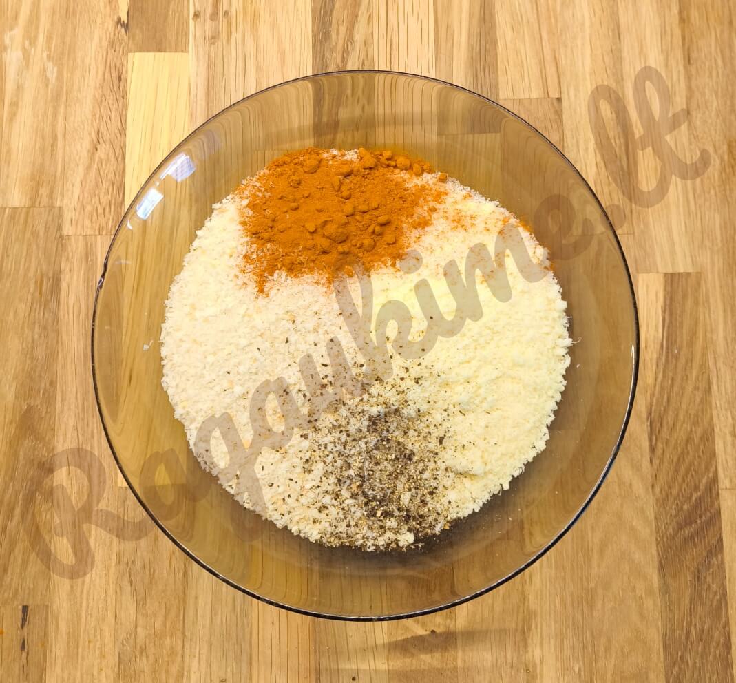 • Panko džiūvėsėlius sumaišykite su tarkuotu kietuoju sūriu, rūkytos paprikos milteliais, druska, pipirais ir, jei naudojate, kitais prieskoniais.